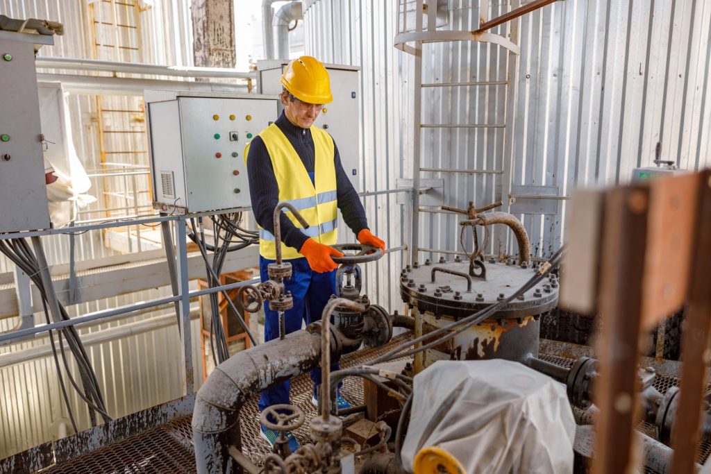 Worker welding in oxygen mask in a factory